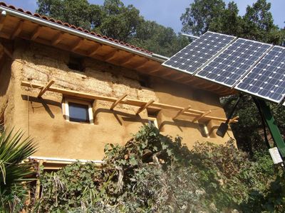 They built their home themselves. A natural building consisting of a timberframe (with local wood), strawbales, and earth and clay plasters. Of course, the energy for the house is solar, since the house is totally off grid. Stéphane also designs and installs solar systems for people in the area.